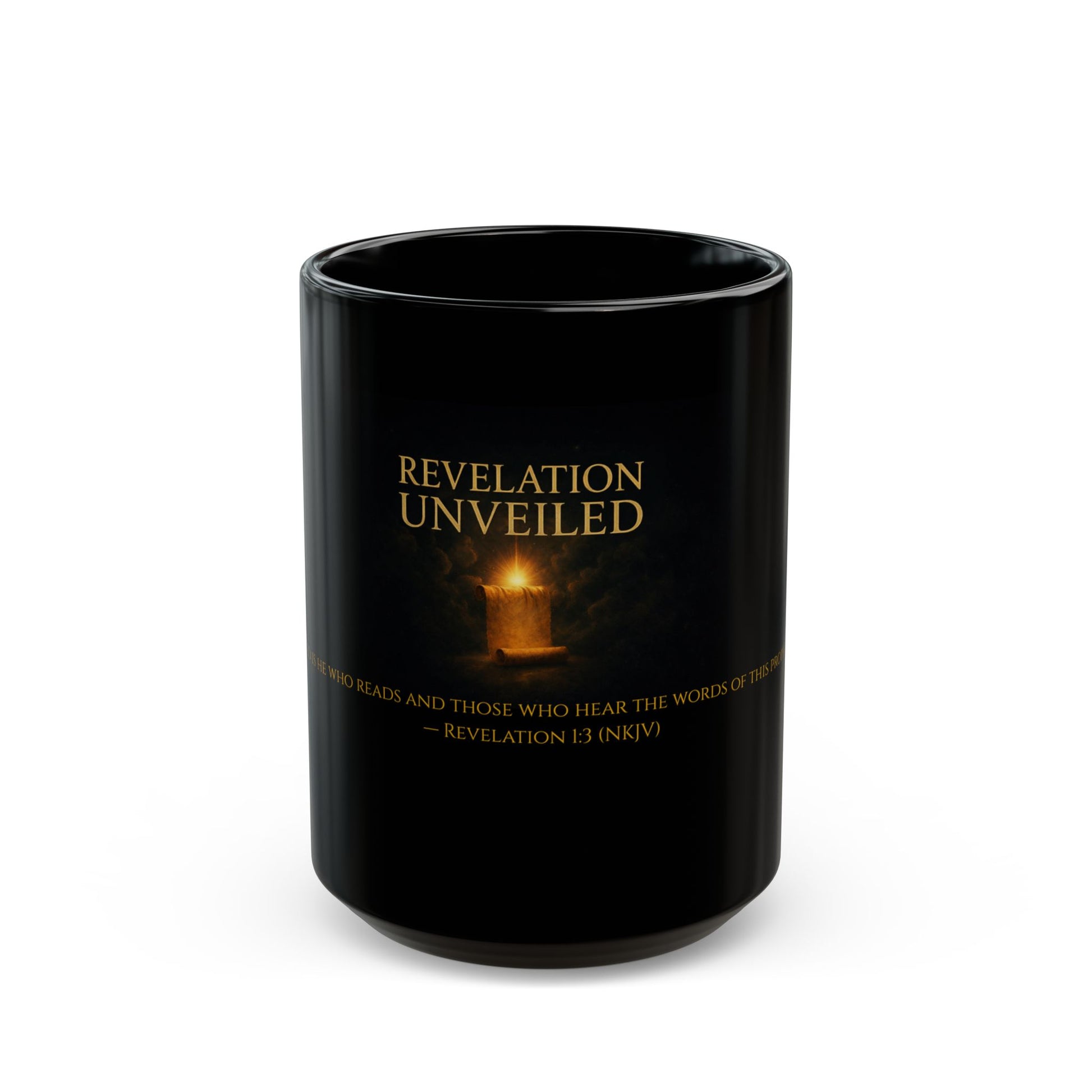 A glossy black ceramic mug designed for quiet moments of reflection, study, and prayer. Featuring Revelation 1:3 (NKJV) in warm gold tones, this mug draws inspiration from the opening blessing of Scripture’s final book—reminding the reader that there is blessing in reading, hearing, and keeping God’s Word.