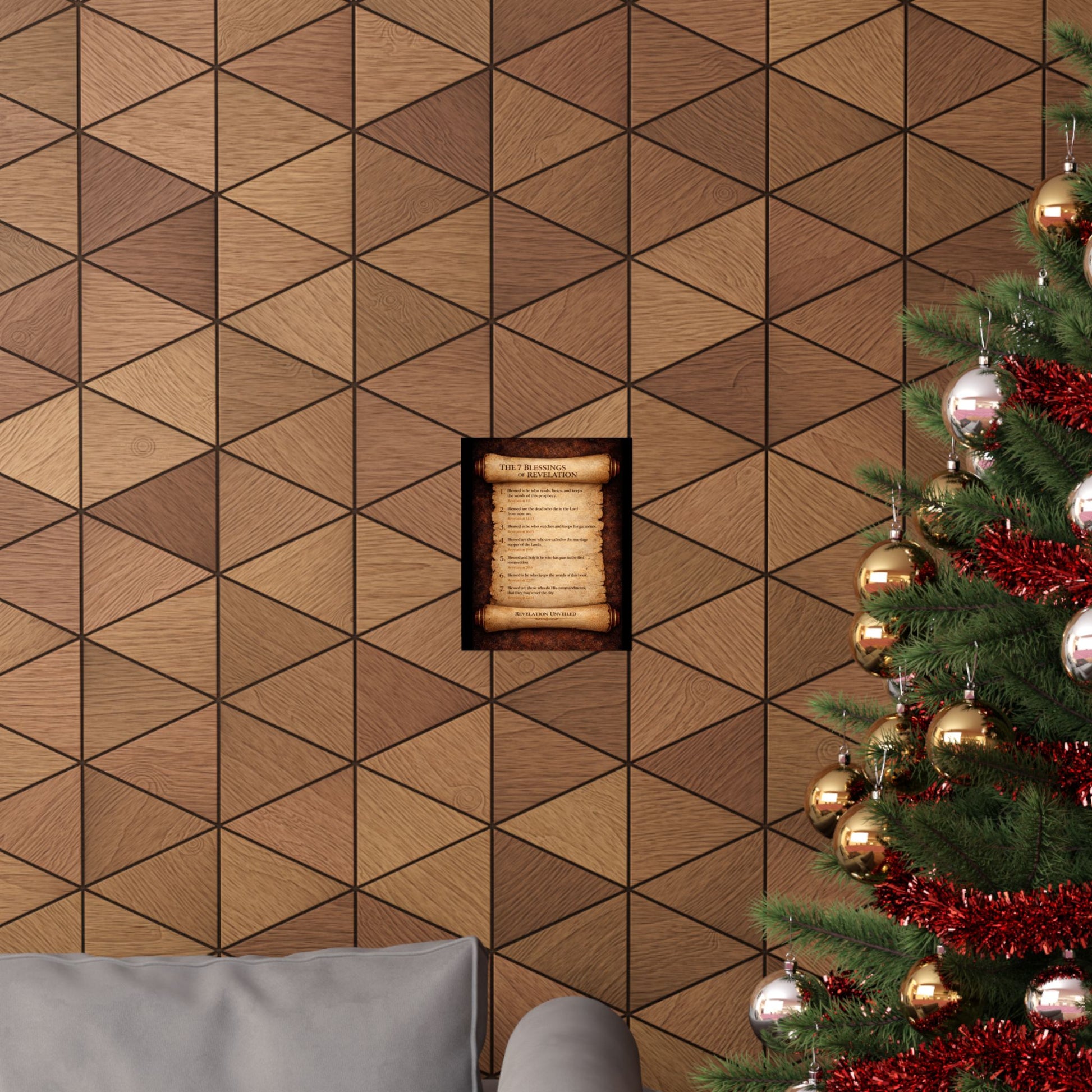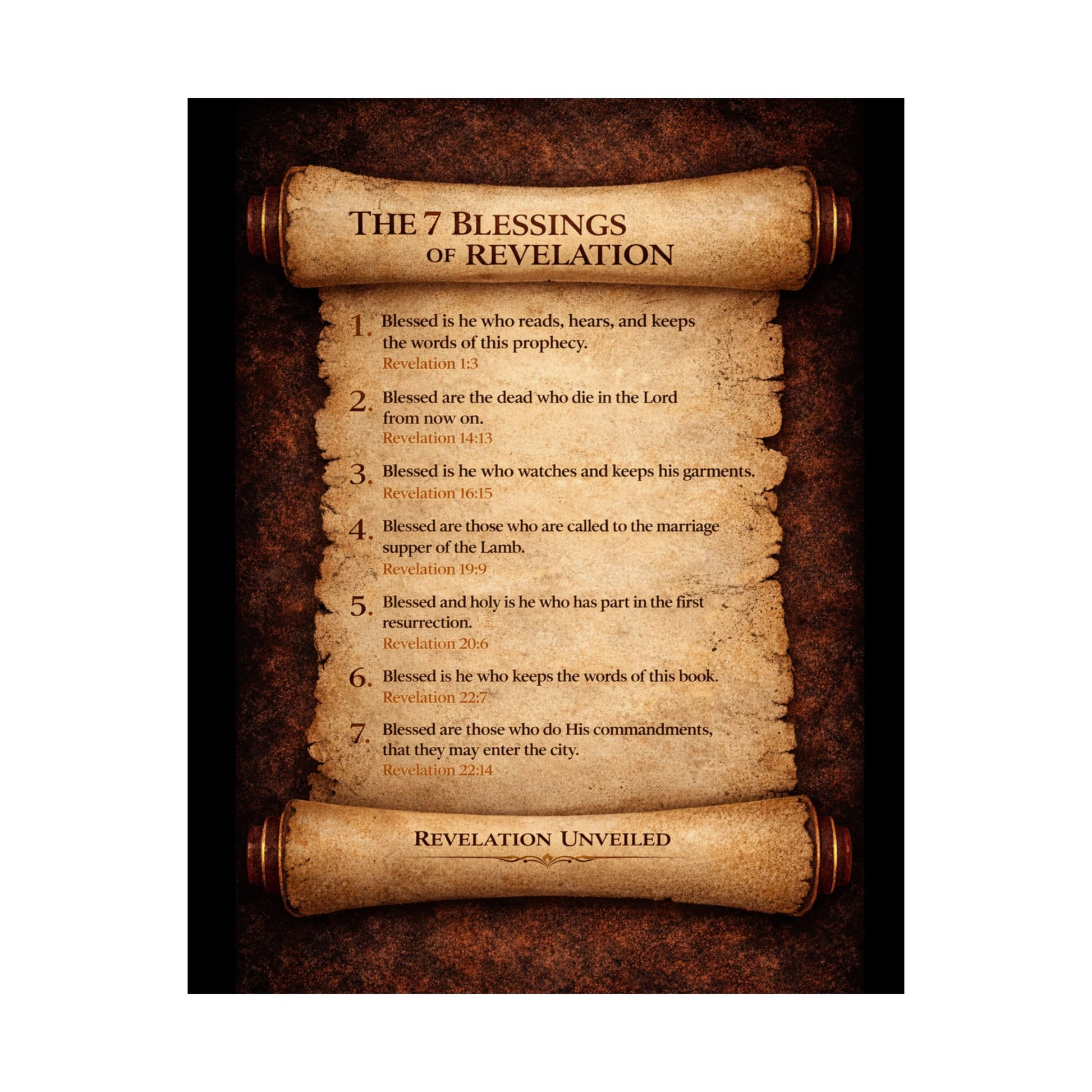 This Scripture art print features all seven blessings found in the Book of Revelation, displayed on a radiant golden scroll against a deep black background. Designed to echo the solemn beauty and prophetic weight of Revelation, this piece brings Scripture into view with clarity, reverence, and visual impact.