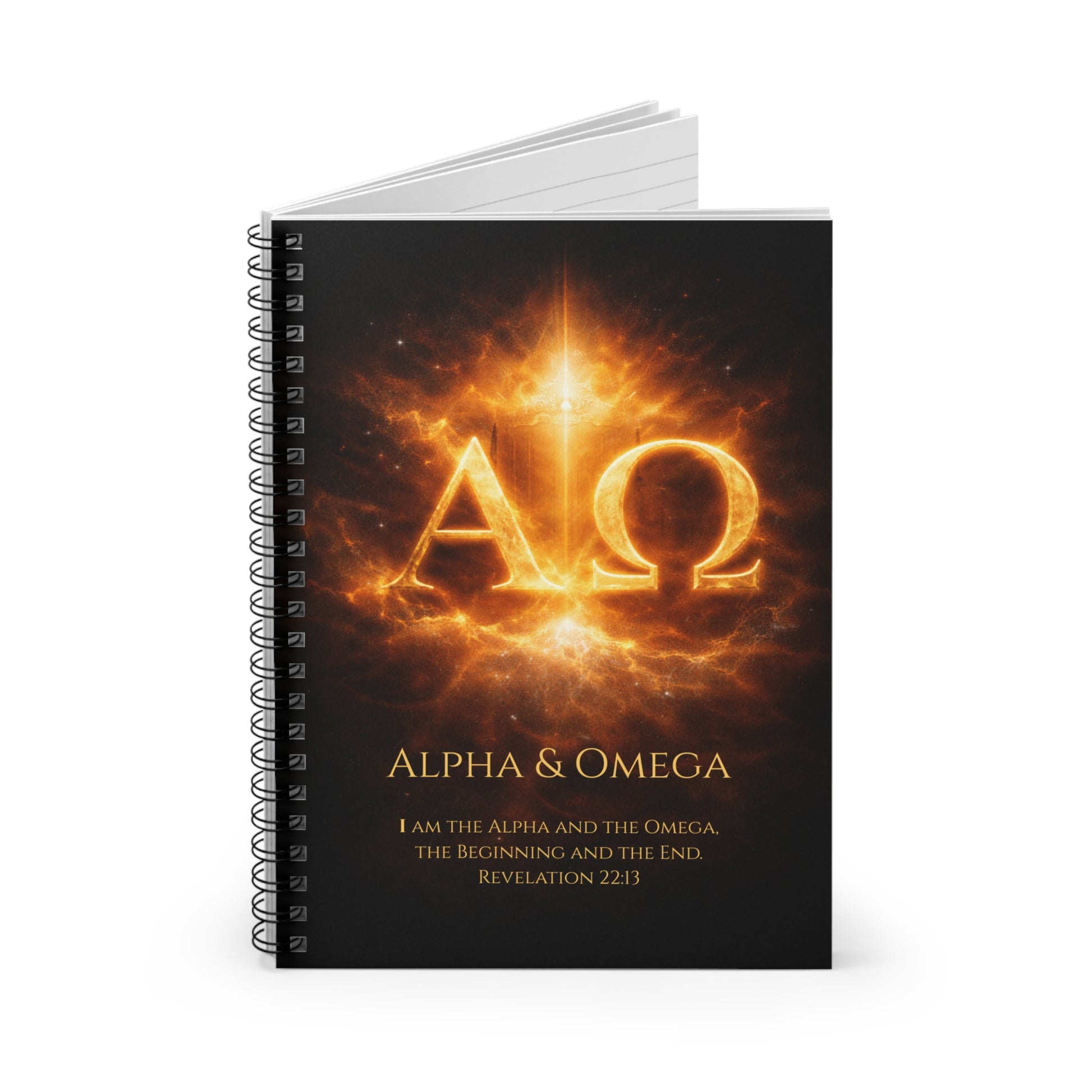 Featuring a radiant Alpha (Α) and Omega (Ω) design set against a deep black background, this notebook reflects Jesus’ declaration in Revelation 22:13—the Beginning and the End. The glowing gold imagery evokes authority, eternity, and divine sovereignty, making this journal both inspiring and visually striking.
